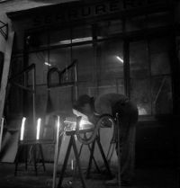 Photographie: J. Thévoz, Artisan serrurier-ferblantier fabriquant des lettres pour enseignes, Fribourg (BCU Fribourg, Fonds J. Thévoz).